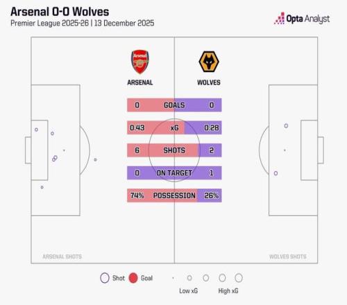在这场看似实力差距巨大的比赛中,阿森纳上半场6次射门却无一命中目标,预期进球数仅为0.43,根据Opta的统计,这同时也是枪手本赛季至今在英超联赛中首次遭遇上半场0射正的情况。